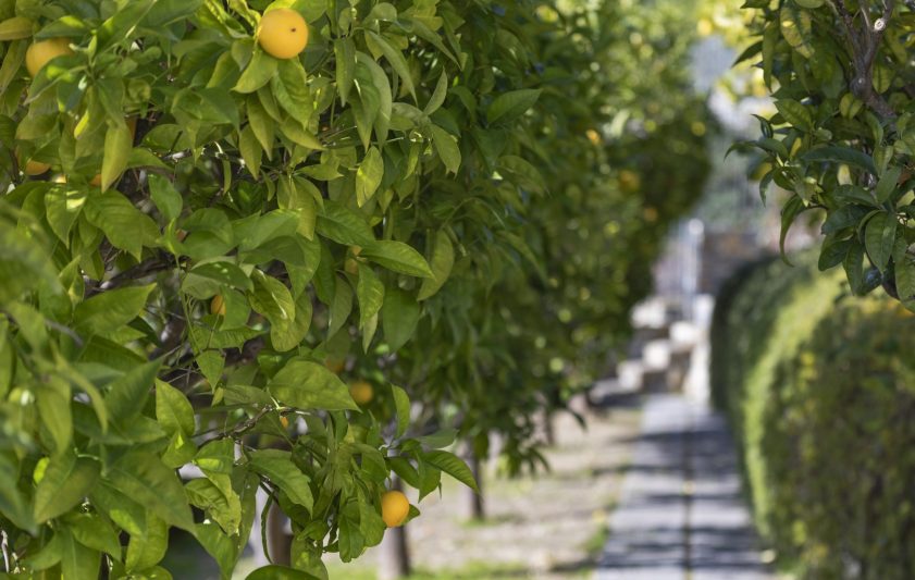 Giardino curato con muretti in pietra e vialetti